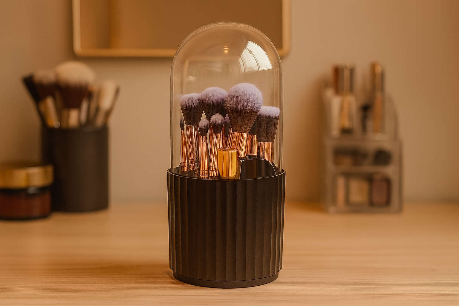 MakeupDome samlar dina sminkborstar, pennor och verktyg på ett och samma ställe – överskådligt, rent och lättillgängligt. Du slipper röran på sminkbordet och får en bättre start på dagen.