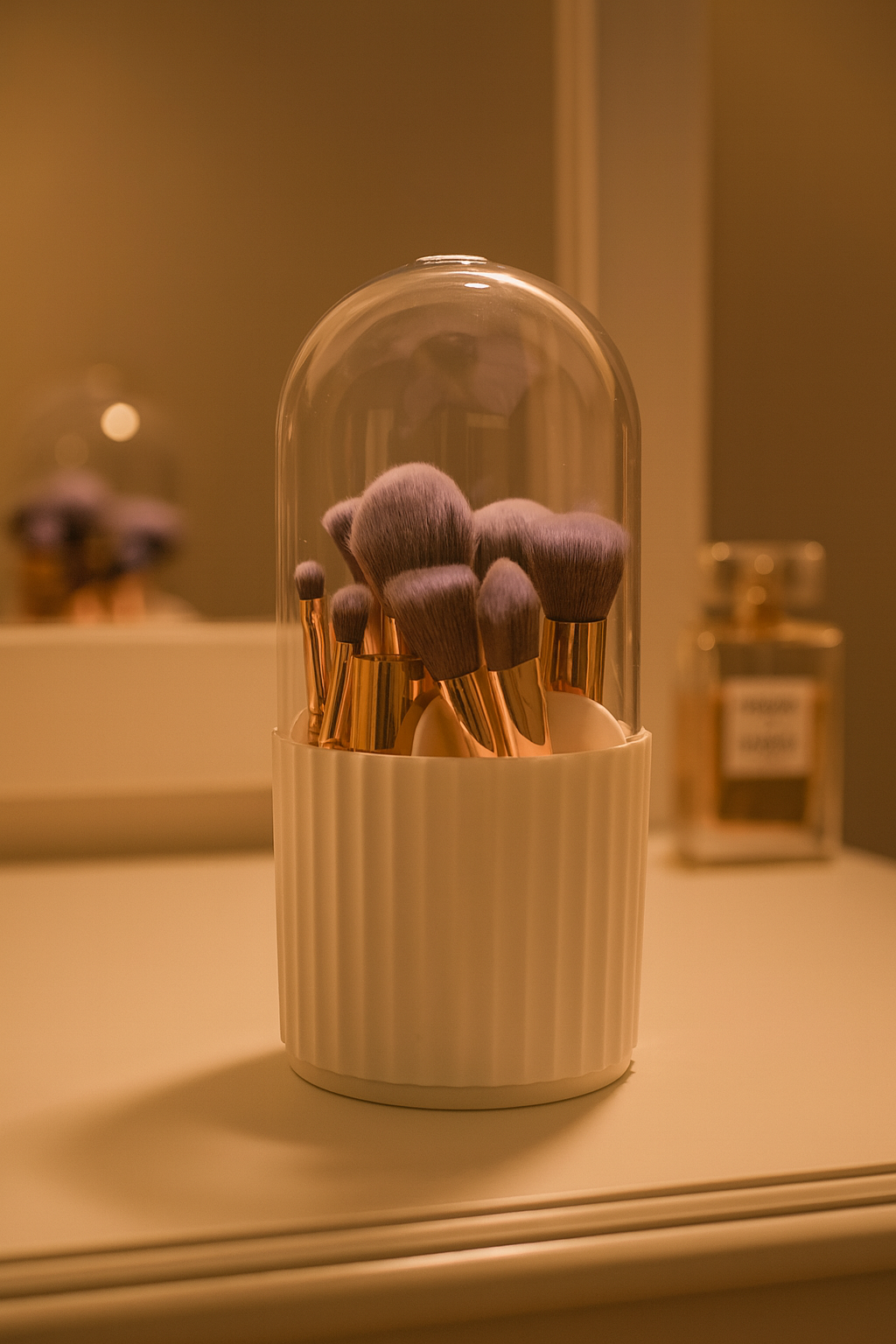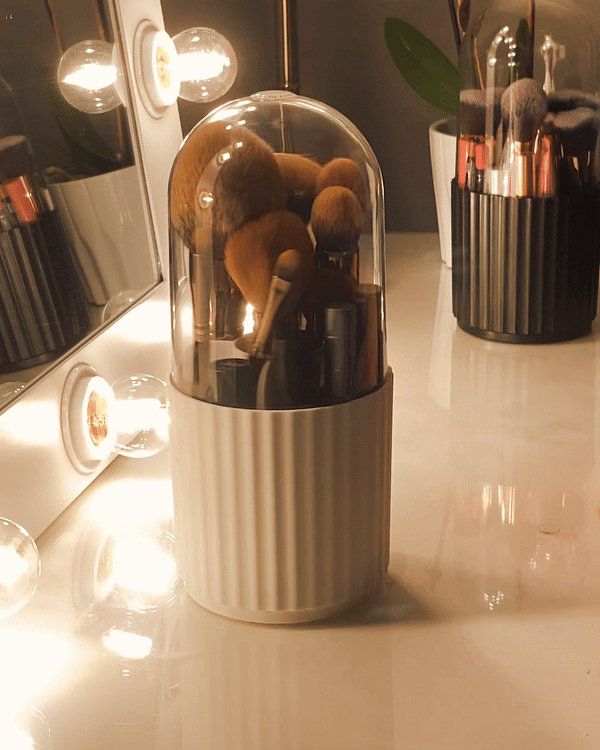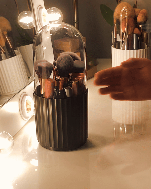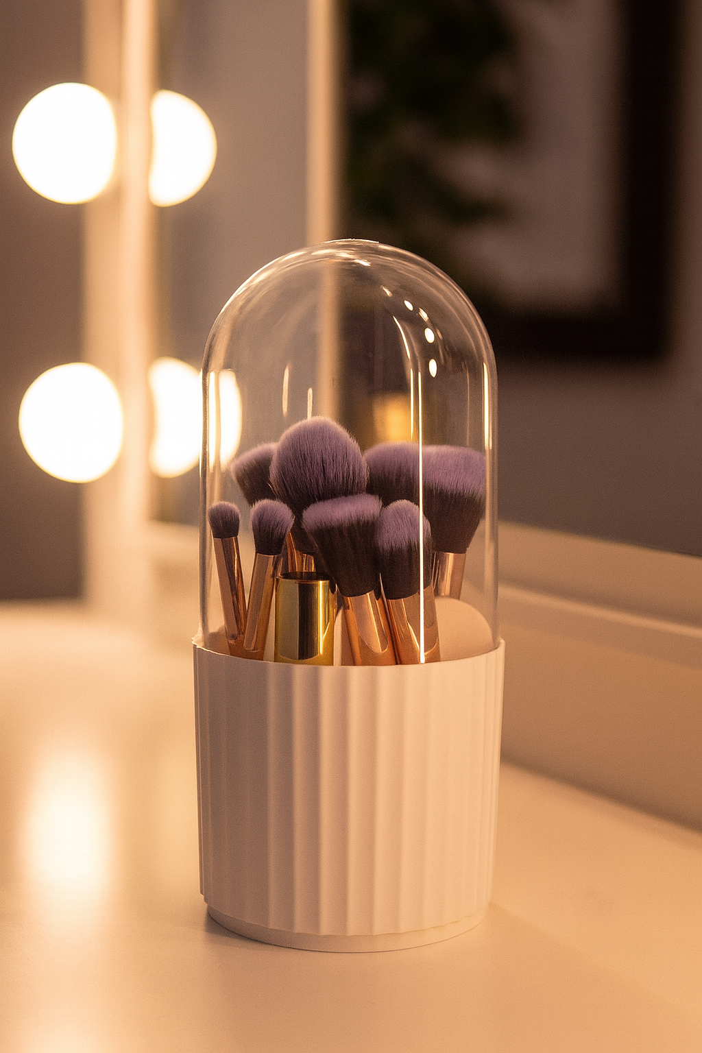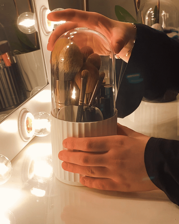 MakeupDome samlar dina borstar och sminkverktyg på ett rent och genomtänkt sätt. Den roterande designen gör allt lättillgängligt och skyddar samtidigt mot damm och fukt.